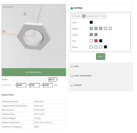 Real-time pricing: Upload → choose material → (for FDM prints, set infill/weight) → pick finishing → see price & lead time instantly. Our pricing is fully transparent — no hidden setup fees or surprise charges. If your project requires special finishing, tight tolerances, or custom materials, click “Request Manual Quote” to get a tailored estimate directly from our engineering team.